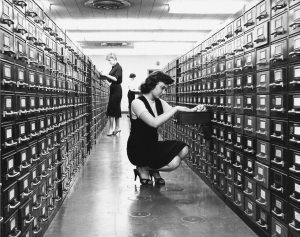 The woman in the photograph below, has been happy to squat and kneel for the last seven years of her employment, and she was thankful for it. But other women, like the one standing in the background, has filled her head with hormonal nonsense. She has been encouraged to learn to read and write, and not simply just fish cards out of a draw haphazardly and offer it to an important man at a desk. Women have formed a secret committee within the area, where they try hard to have their own ideas, develop them whilst drinking tea, and write them down on some sort of doily, probably. Due to the horribly liberal attitude of local councillors, no less than three women are now teaching in the college. This must be stopped. Have they no dignity? Have they no self-control? Have they no housework to do?