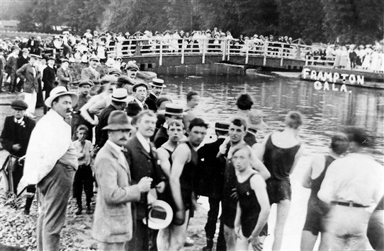 It was a marvellous sight by the canal, men and women flocked to the waterside and pointed at things. Some people stood on the bridge and pointed at the people pointing at things. The spotty youth in the foreground became fractious about the woollen bathing suit he was wearing (the Wool Rash has only just gone). He dispersed the crowd by shouting. He’s a frightful boy, with breath like a boar’s arse.