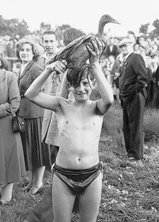 Next to the Tudor Catflap & Toasting Fork Society, and just in front of the Order of the Sacred Bedpan Dangerous Sports Arena, was the Duck of Philosophy Eventing. This young man typically shows what is involved in the process. The duck seized firmly but calmly, then held above the head. The duck, in a series of resonant and meaningful quacks, orates at length about the tenets the individual could embrace in order to gain a life of fruitfulness. It’s a marvel, however the only soul present that can interpret what the duck is speaking of, is another duck.